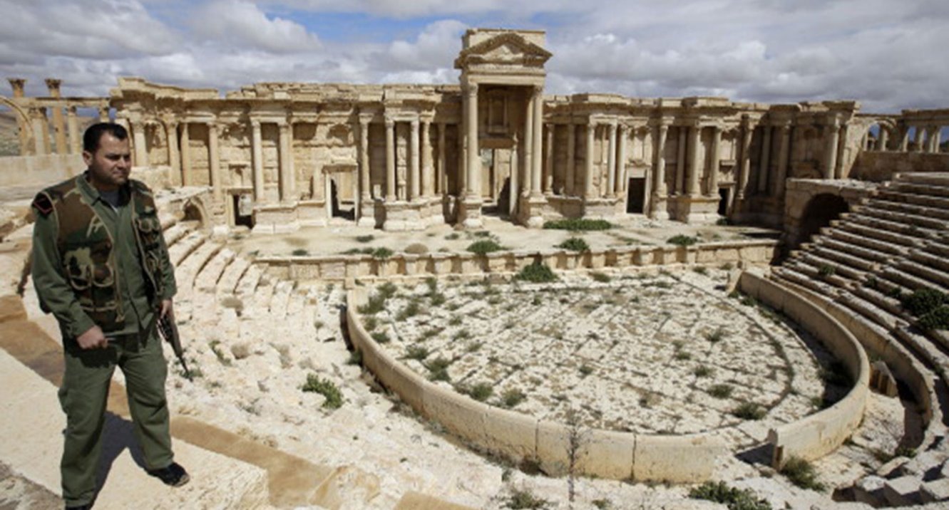 Featured Image: A Syrian policeman patrolling the ancient oasis city of Palmyra. ISIL, also known as “Daesh the Filthy,” reportedly blew these ruins up earlier this year. JOSEPH EID/AFP/Getty Images