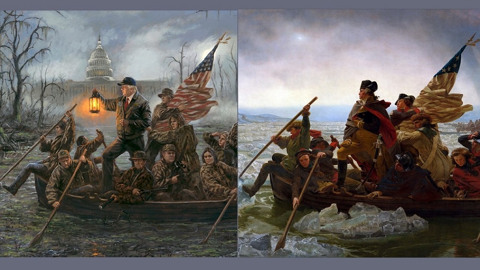 McNaughton’s painting is conservative art. It depicts the Trump administration in a positive light: the president and his cabinet navigate the swampy waters of Washington DC’s bureaucratic corruption. In classical fashion, it is realistic and is directly modeled on the 1851 painting, “Washington Crossing the Delaware,” by Emmanuel Leutze.