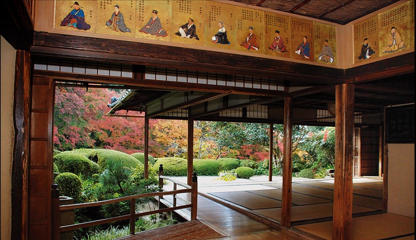 The Shisendō is a hideaway villa in the eastern hills of Kyoto, Japan, created by poet and calligrapher Jōzan Ishikawa (1583–1672) as a place where he could read and write classical Chinese poetry in retirement. He chose 36 immortal poets, whose portraits (with their finest verses) appear around the upper portion of the walls in his study. The villa is surrounded by a garden; Jōzan gave imaginative names to ten locales within it, and to twelve scenes beyond its limits. The characteristic sound of a water mortar or “deer-scarer” is heard at regular intervals throughout house and garden.