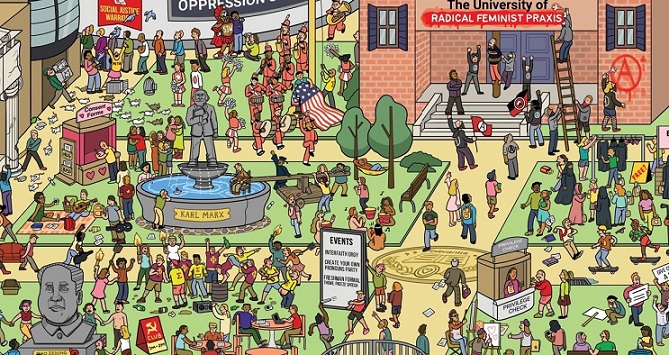 Most college campuses, especially the Ivy League and other prestigious institutions, are exactly as depicted in the Saunders cartoon. I only wish the artist had included caricatures of the faculty and administrations, who are the real source of the intellectual poison.