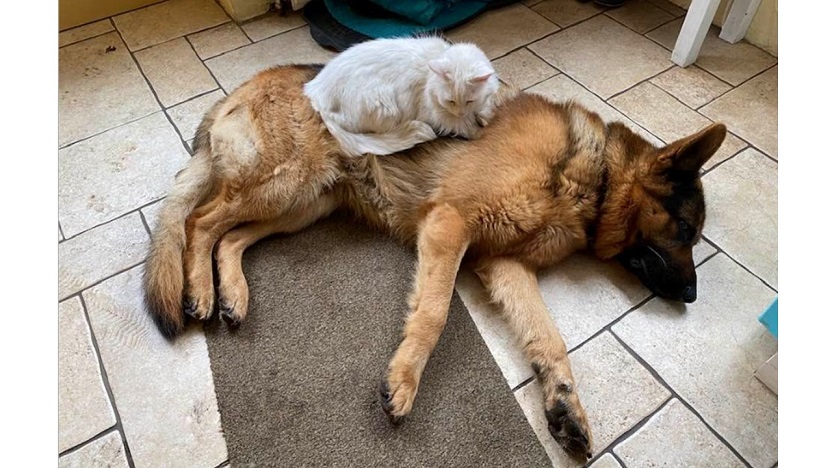 Cute one. Enjoyed it. Although the dog is large, the cat thinks he’s in charge.