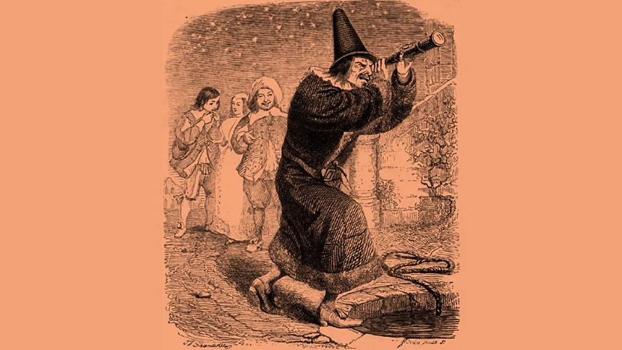 The story of Thales falling into a well while stargazing was usually taken as an anti-intellectual comment — his head was “in the clouds” when his attention should have been more down-to-earth. Here Dickey has made it into a symbol of the self-absorbed narcissism of idiots who walk around with their eyes glued to their FLHHDs (f—–g little hand-held devices), completely oblivious of anything around them.
