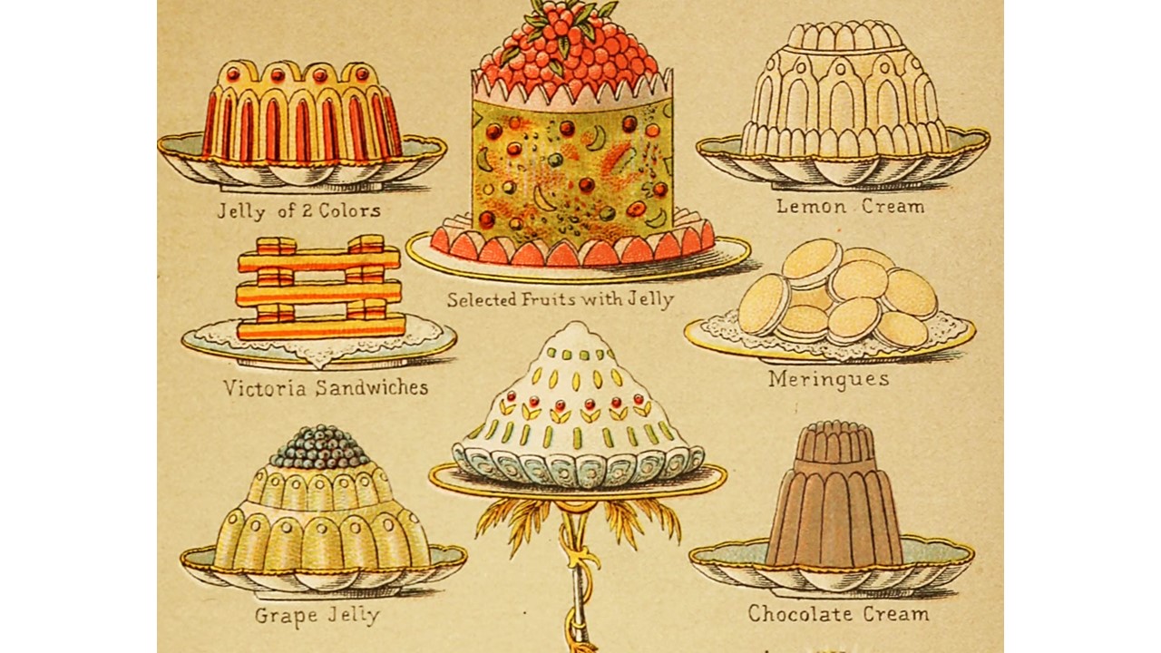 At teatime with gateaux and sugary biscuits.