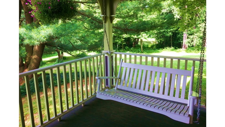 On a porch swing—the garden lush.