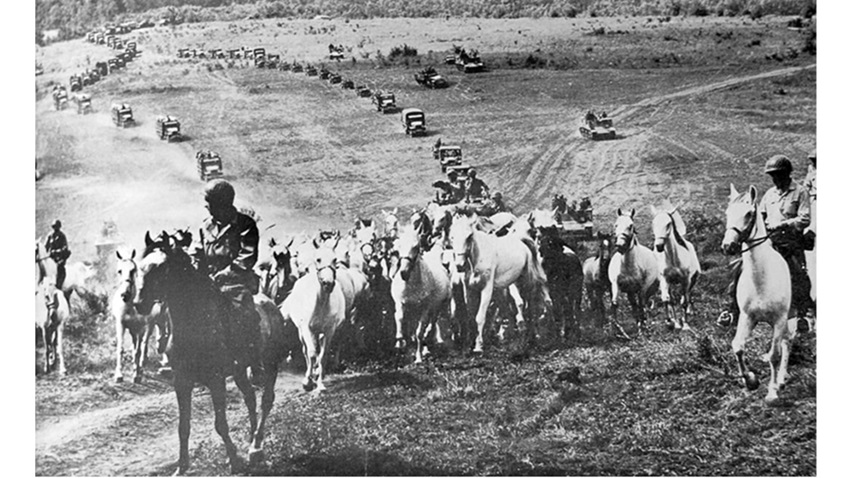 One celebrates a military hero for deftly directing a most unusual operation to rescue a cultural institution. The feat was all the more difficult because he had to disregard an allied pact–but you show how foolish it would have been to observe it, with Lipizzan horses becoming horsemeat for Soviet troops, and probably for war-worn hungry Germans as well. Twelve hundred horses gathered by tanks and American cowboy outriders deserve the generic group name “herd.” There was probably no time to sort out the most desirable animals before they were all stampeded to safety. Brilliant strategy.